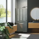 Det korte, faste sidepanel gør det muligt at møblere tæt op ad brusehjørnet. Når du ikke bruger bruseren, kan dørene skubbes ind uden at ramme armaturet, og så har du mere plads.