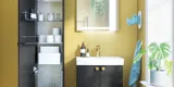 Bryd med det traditionelle og placer dine skabe der, hvor de kan være. Pladsen over toilettet er ideel og ofte uudnyttet, og vælger du overskabe med en lille dybde, får du masser af skabsplads – uden risiko for at slå hovedet op i dem, når du rejser dig fra toilettet. Med en asymmetrisk placering, som her, skaber du samtidig en visuel lethed i udtrykket, når du indretter det lille badeværelse.