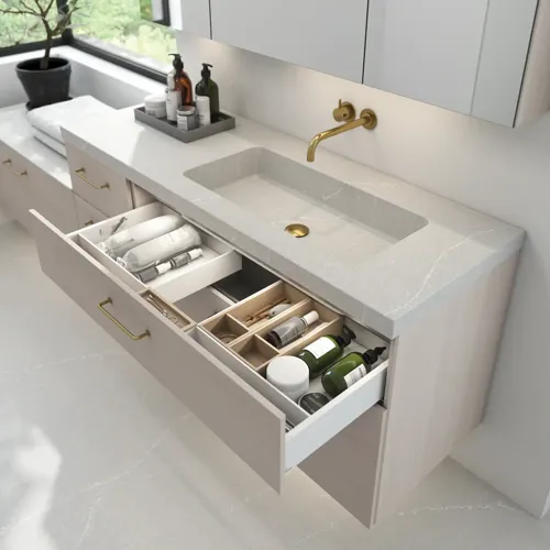 Gør dit nye badeværelse til et friskt åndehul med vores udvalg af møbler fra Dansani. Vi tror på, at dit badeværelse skal være mere end bare et funktionelt rum - det skal være et sted, hvor du kan slappe af og genoplade. Vores skønne møbler kombinerer stilfuldt design med praktisk funktionalitet for at skabe et badeværelsesmiljø, der inspirerer og opfrisker.
