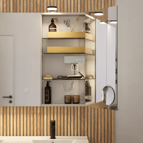 Mange af vores spejlskabe er med lysstyring, hvor du selv styrer lysets farve og styrke på et lille integreret touchpanel, der sidder inde i spejlskabet. På den måde bliver din naturlige døgnrytme ikke forstyrret af unødvendigt skarpt og koldt lys, når du gør dig klar til natten. Du dæmper blot lyset og indstiller det i en varm tone. Når du skal vågne om morgenen, kan du omvendt tilpasse lyset i en køligere tone og øge lysstyrken.