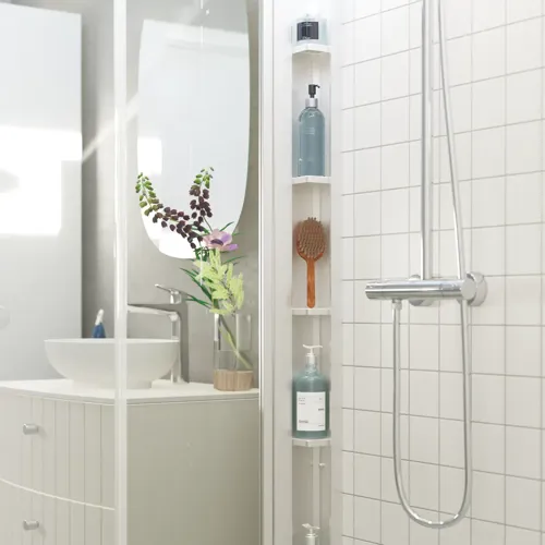 Alle hader et rodet badeværelse og især i bruseområdet. Med Tower-hjørnehylden som en integreret del af Match serien kommer der opbevaringsplads til shampoo, sæbe og hvad man ellers har behov for til badet. Tower fås i både sort og satin.