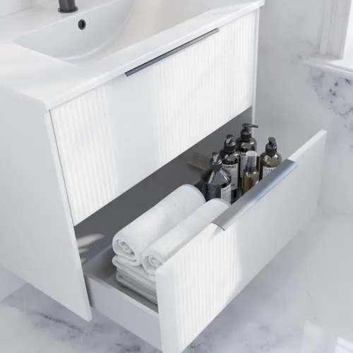De stribede fronter giver det klassiske hvide badeværelse et skønt twist og understreger det nordiske udtryk. Der er naturligvis god plads i skufferne, som kan trækkes helt ud, så du har overblik over alt dit indhold.