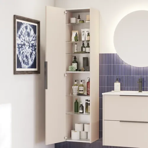 Mido+ Classic lyse sandfarve gør dit badeværelse varmt og indbydende. Udnyt skufferne til stort og småt - her er god plads. Højskabet tilpasser du selv til alle dine flasker og håndklæder med de praktiske 4 flytbare glashylder.