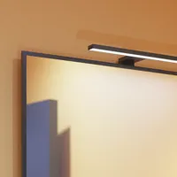 Kombinationen af den smalle lampe, rammen på Select spejlet og vaskemøblets slanke sorte greb binder det stilfulde udtryk sammen.