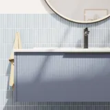 Den himmelblå farve er en beroligende farve, som passer smukt til et velværerum, som badeværelset jo er.