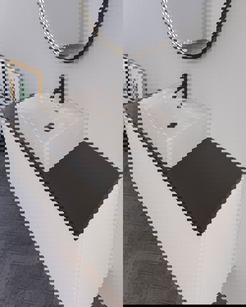 Når du bestiller en bordplade hos Dansani, kan du vælge et vaskeskab og en bordstående vask, som placeres ovenpå bordpladen for et stilrent og fleksibelt design. Husk at du hertil også skal vælge udskæring, så afløbet passer mellem håndvask og bordplade. Vores system gør det let at sammensætte den løsning, der passer til dit badeværelse – uanset om du vil have rene linjer, kontraster eller funktionel opbevaring. Alle bordplader kan kombineres med vores skabe og tilpasses efter dine behov.
