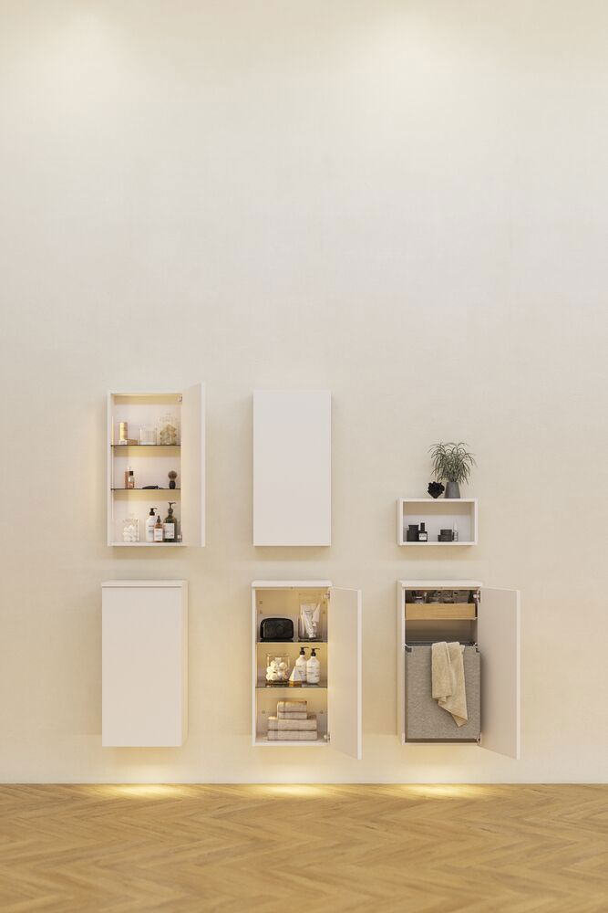 Drømmer du om et badeværelse, hvor der er styr på tingene, og alt har sin plads? Med skabe til badeværelset kan du nemt skabe orden og overblik. Et godt badeværelsesskab hjælper dig med at organisere både små og store ting – fra tandbørster og vatrondeller til håndklæder og rengøringsprodukter. Uanset om du vælger et overskab, højskab eller underskab, får du en praktisk løsning, der samtidig ser flot ud i dit badeværelse. Vores skabe er designet med fokus på både funktionalitet og æstetik, så du kan skabe en rolig og indbydende atmosfære. Til vores skabe kan du tilmed få funktionelle træbakker og anden indretning, som gør oprydning og orden til en leg på badeværelset.