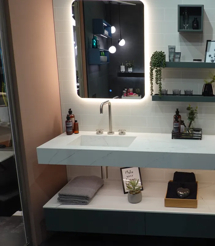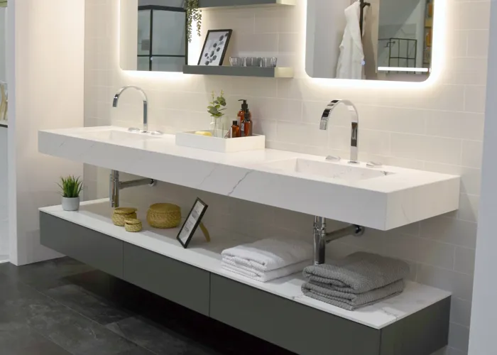 Quadra håndvaske og bordplader efter mål fås i alle Silestone-overflader. Kombiner Quadra med møbler, spejle og tilbehør fra Dansani Calidris-serien for at skabe alsidige designs, der passer ind i ethvert rum og giver badeværelset et sofistikeret udtryk.