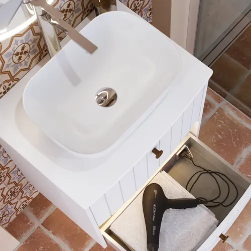 Hvide overflader reflekterer lyset og har en nærmest magisk evne til at få rummet til at virke større og mere luftigt. En hvid bordplade fungerer derfor perfekt i både små og store badeværelser, hvor den bringer ro, balance og åbenhed. I Calidris-serien kan du opnå et særligt minimalistisk udtryk med en tynd, hvid solid surface-bordplade, som svæver elegant over vaskeskabet. I Luna-serien giver kombinationen af en hvid mat laminatbordplade og en matchende porcelænsvask et stilrent, men hjemligt udtryk. Uanset valg af materiale er den hvide farve med til at fremhæve rummets detaljer – fliser, armaturer eller skabe – og skaber en helhed, hvor lys og materialer spiller sammen. Med muligheden for specialmål tilpasses bordpladen præcist til dit rum og understøtter en arkitektonisk ren linjeføring. Det er det hvide udtryk, når det er bedst: funktionelt og poetisk på én gang.