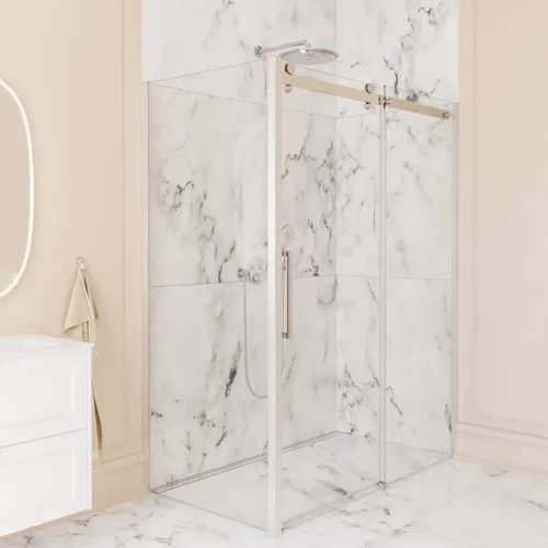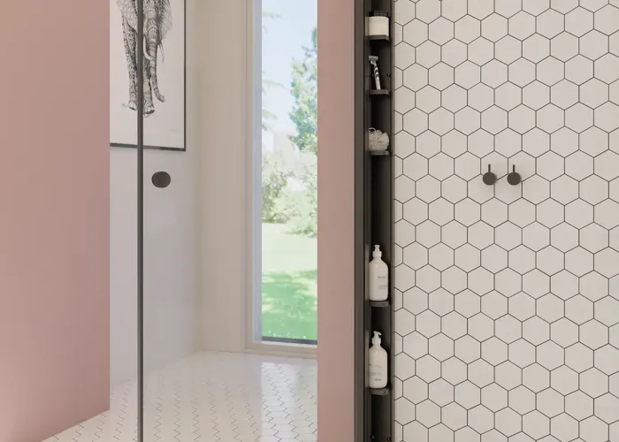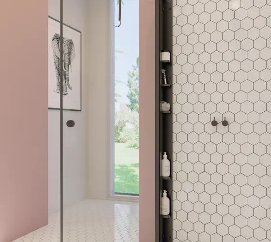 Det korte, faste sidepanel gør det muligt at møblere tæt op ad brusehjørnet. Når du ikke bruger bruseren, kan dørene skubbes ind uden at ramme armaturet, og så har du mere plads.