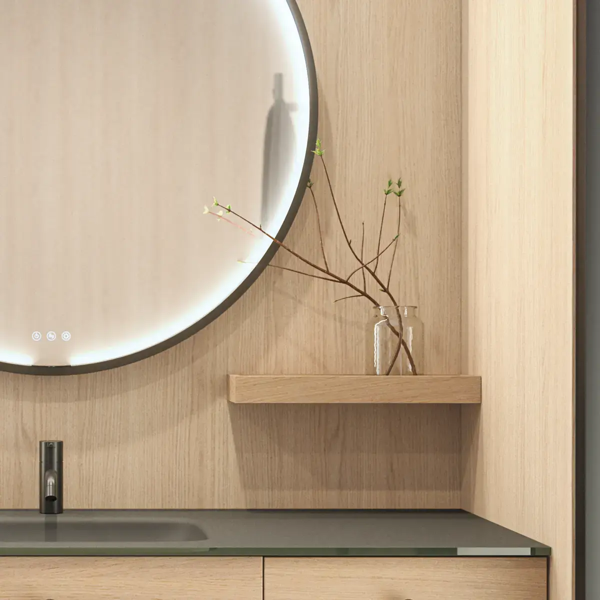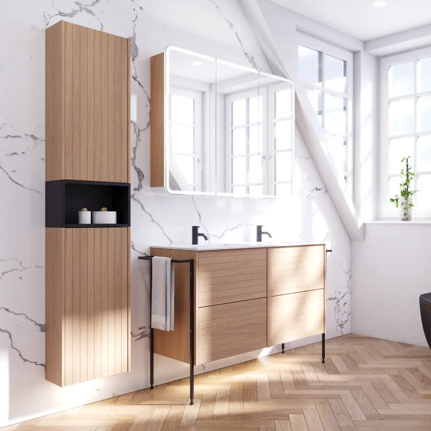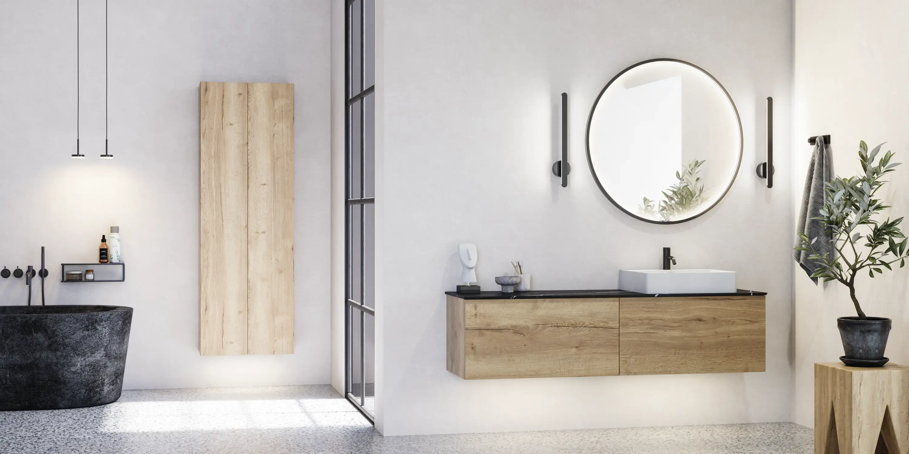 Vi elsker træ – lige fra den lyse til den mørke træsort. Den nordiske, stilrene indretning er lys og åben med lette og funktionelle møbler og smukke, enkle detaljer. Ved at tilføre træ til din indretning ledes tankerne hen mod den skandinaviske, rå natur og skaber liv til badeværelset. Vi har træstruktur i flere af vores serier, men især Calidris skiller sig ud på dette område. Alle Calidristræemner er finerede med massive trækanter i egefinér, og denne egefinér giver en mere jævn kvalitet med en flottere åretegning og forløb af strukturer. Læs mere om egefinér i Calidris.