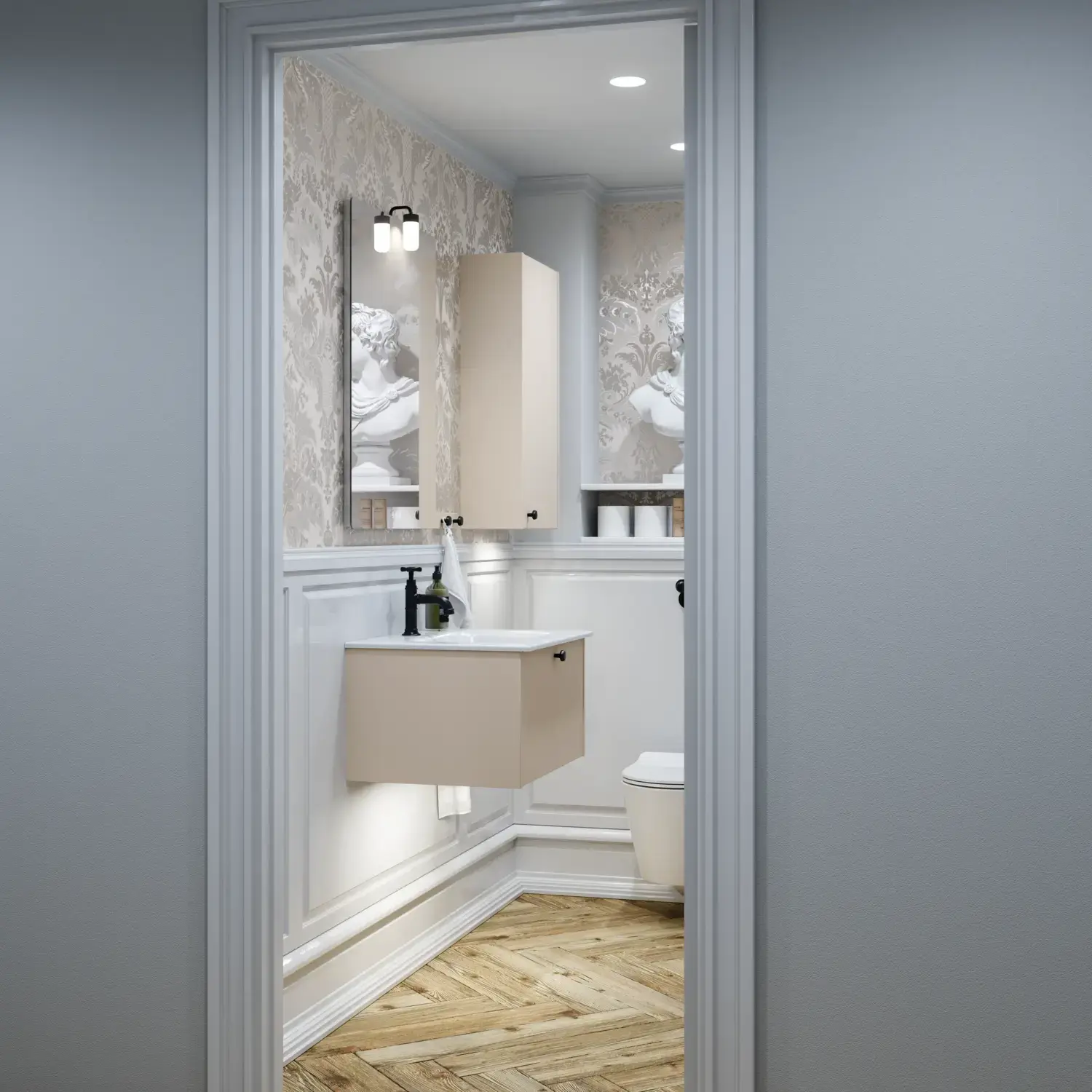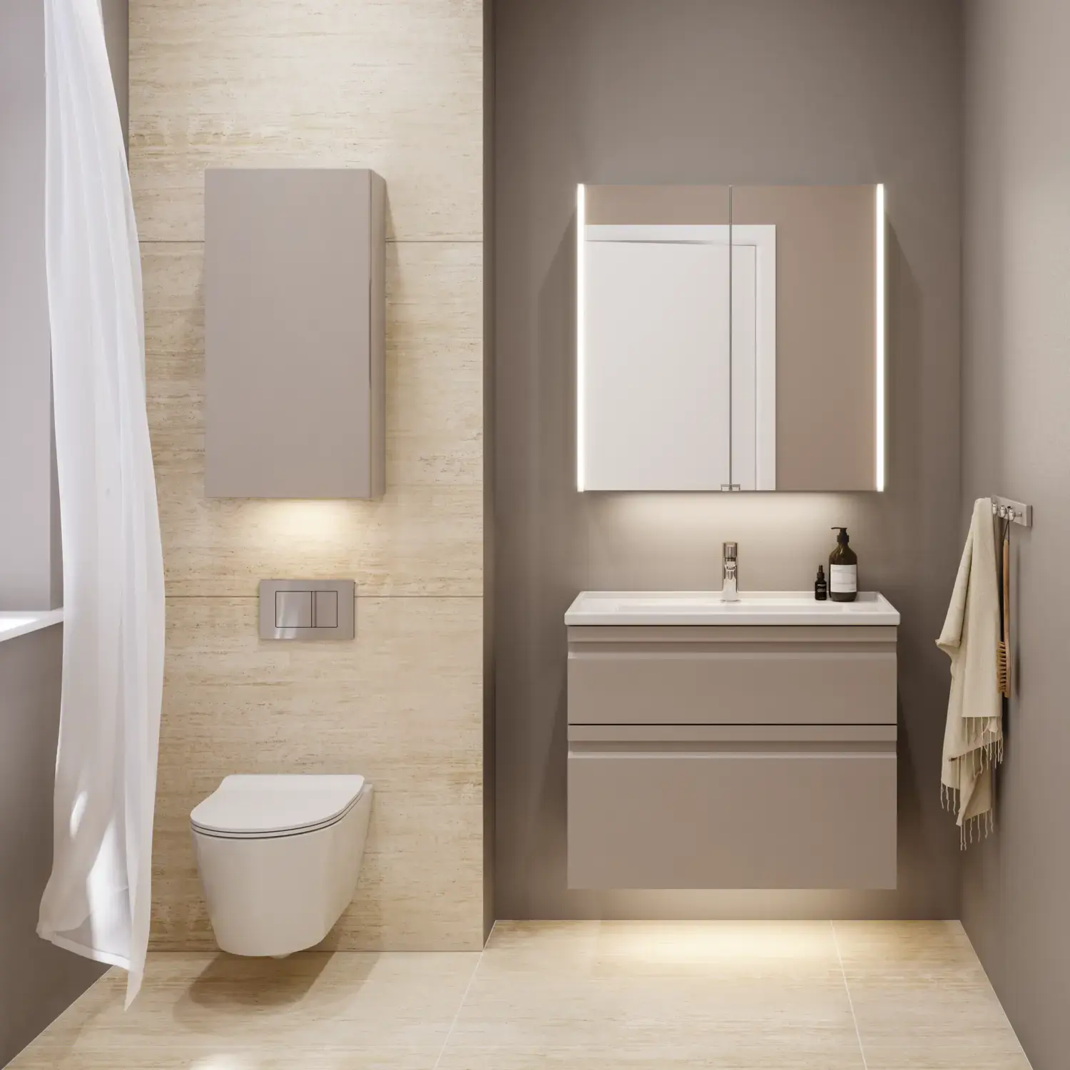 Du kan også indrette med farver i samme nuancer, når du er i gang med din badeværelsesrenovering. Det giver et gennemført, eksklusivt og samtidigt roligt udtryk, når du både holder væggene og dine badeværelsesmøbler i en tone i tone palette. Denne luksuriøse effekt af tone i tone paletter har også en evne til at få små områder til at virke større.