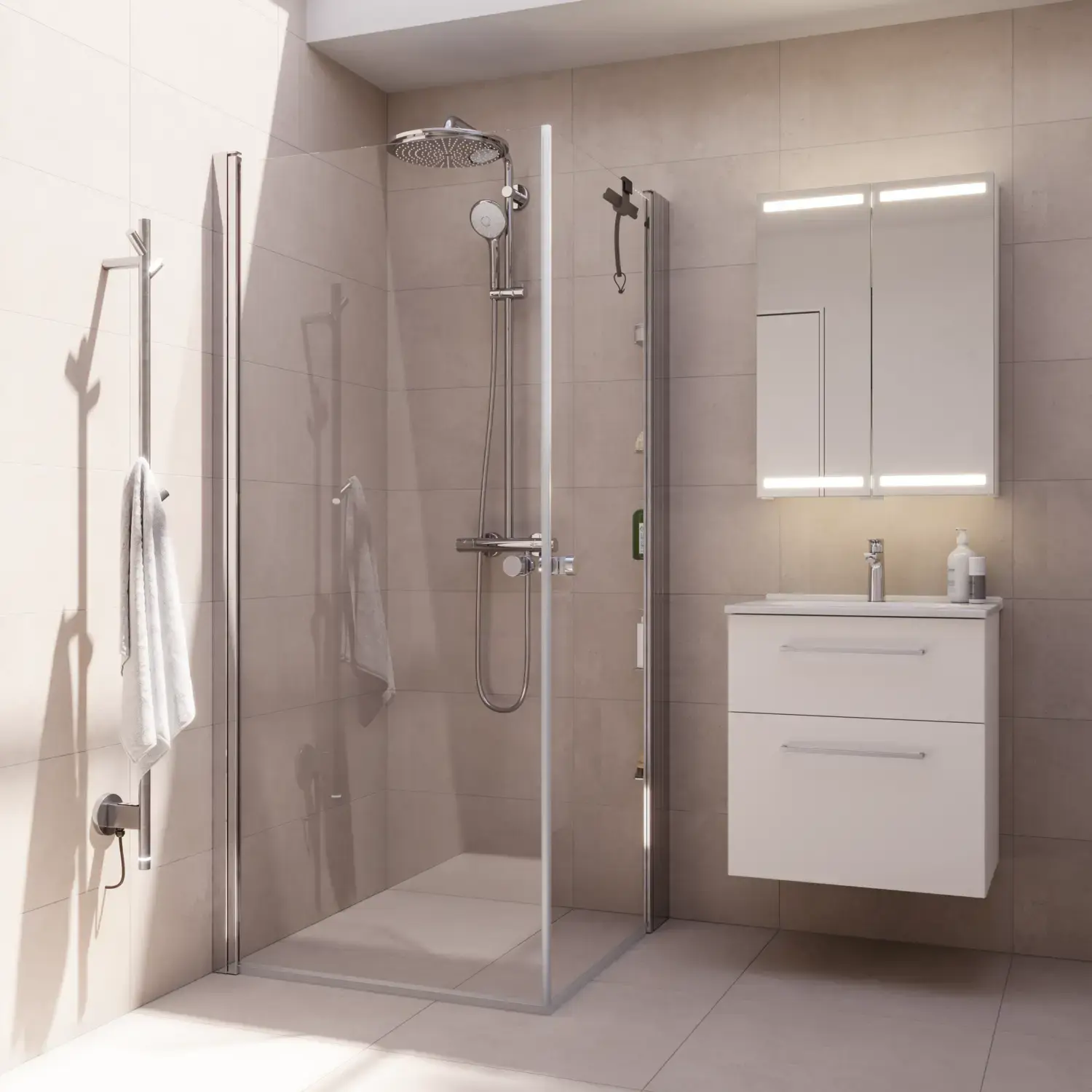 Tip: Udnyt væggene! Kombinér din håndklædetørrer med væghængte skabe eller spejlskabe med opbevaring for at frigøre gulvplads og skabe luft i rummet.
