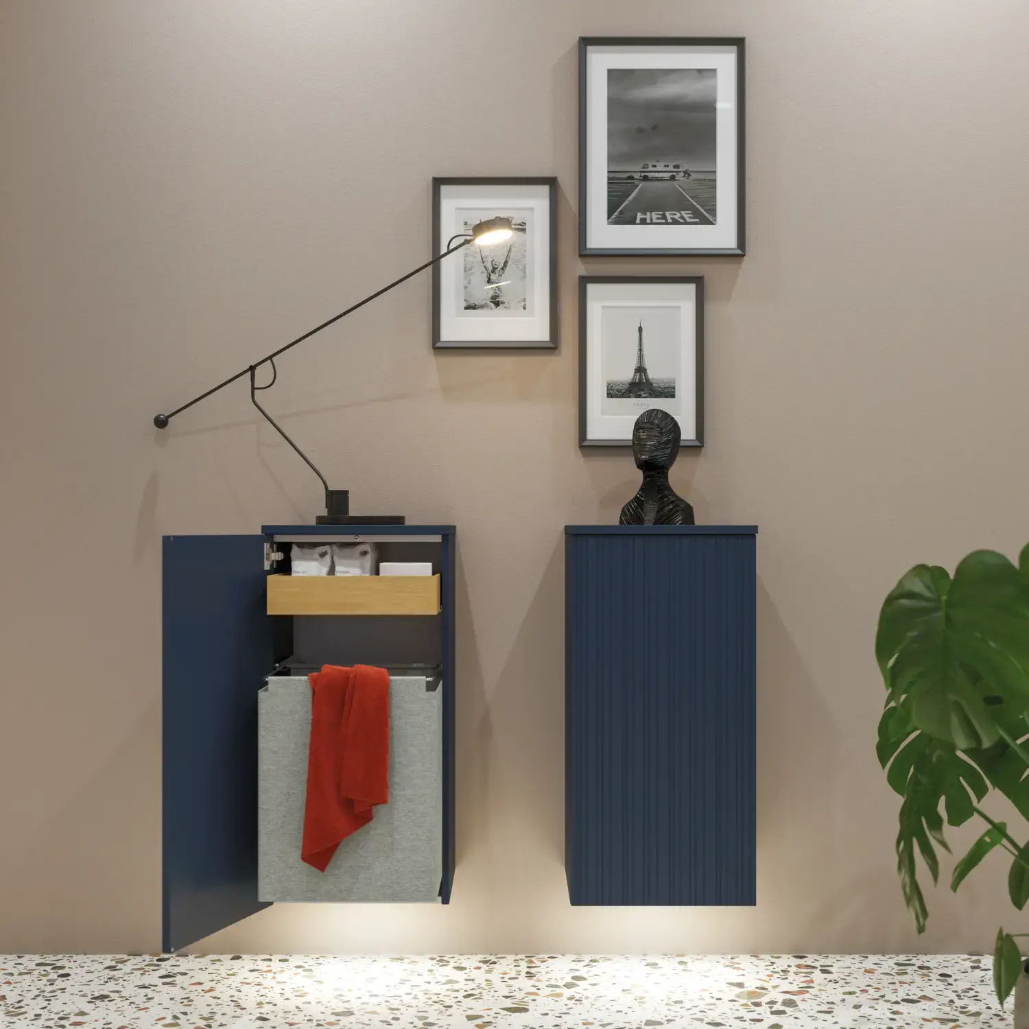 Underskabet udnytter pladsen under en skråvæg eller et vindue perfekt, og giver dig masser af plads til håndklæder og store flasker shampoo. Vælg mellem A-indretningen for maksimal opbevaring eller B-indretningen med en udtagelig træskuffe og en praktisk vasketøjskurv.