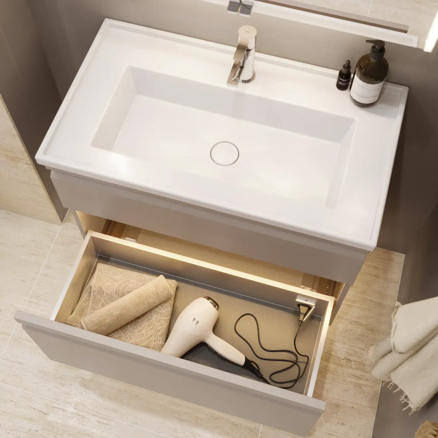 Det er bare nemmere at lade føntørreren eller glattejernet blive siddende i stikket frem for at skulle pakke det pænt væk og rulle ledningen op efter brug. Du skal jo alligevel bruge det igen i morgen tidlig. Gør en dyd ud af din magelighed og indret dig med stikkontakter i skabe eller skuffer, så kan du opbevare dine apparater dér og undgå at tingene roder på badeværelset. Det er også praktisk, når du skal oplade shaver eller tandbørste. Elstik i nederste skuffe følger med, når du bestiller lys til dine skuffer. Det kan desuden købes separat til placering i skuffer og skabe.