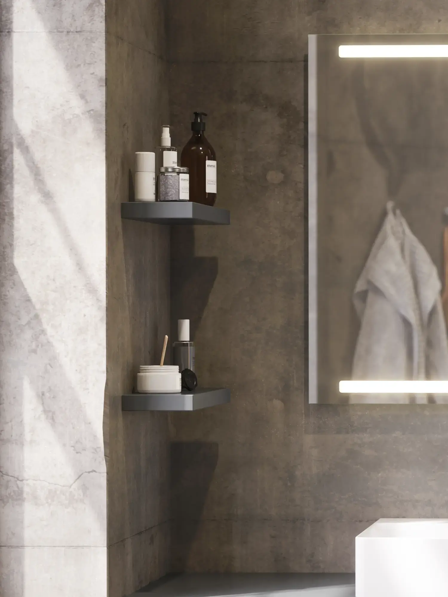 Sørg for at have rigeligt med skabs- og skuffeplads, så du kan holde badeværelsestingene inde og støvet ude. Har du ikke plads til et traditionelt højskab, kan du altid være kreativ og lege med at finde plads til overskabe på utraditionelle steder, som fx over toilettet, radiatoren eller bag døren.