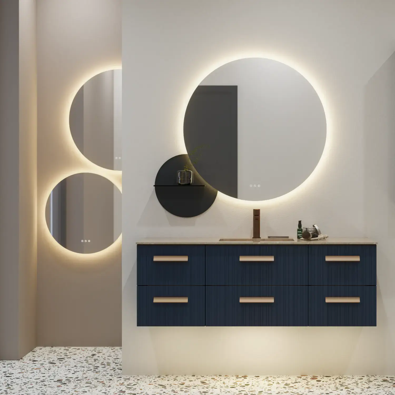Et rundt spejl giver badeværelset en blød og organisk følelse. Et rundt spejl kan skabe en mere afslappet og legende atmosfære og bryde skarpe linjer og hjørner i rummet.