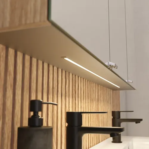- Underlight – udvalgte spejlskabe kan fås med en integreret LED lysskinne på undersiden, som giver et stemningsfuldt lys nedover væggen og vasken.