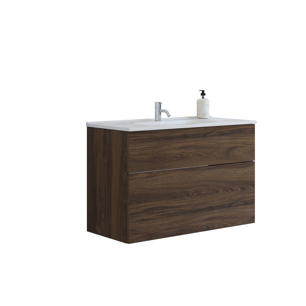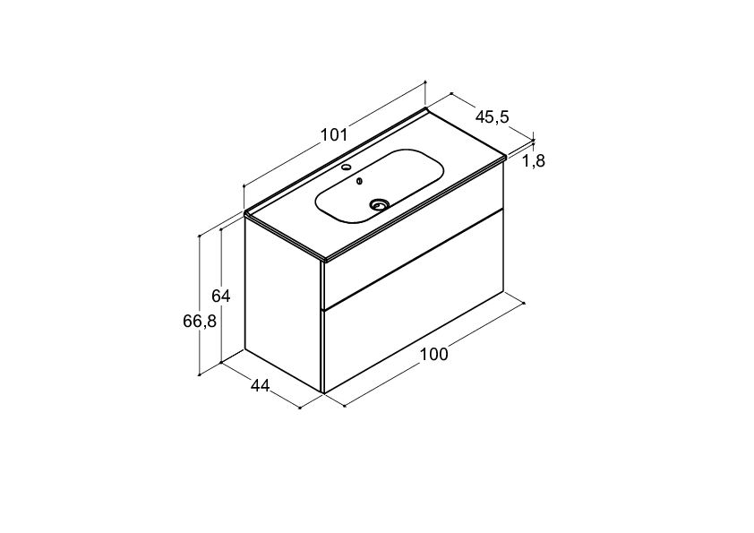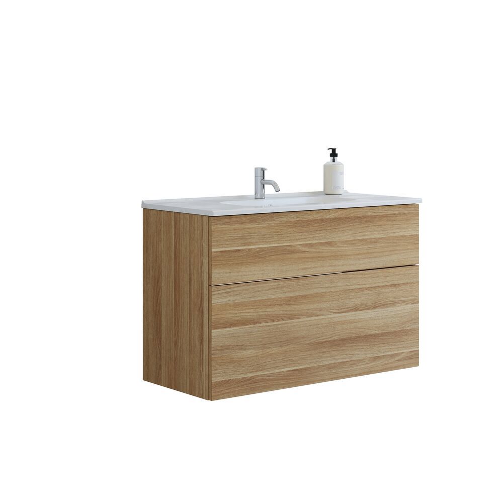Den 100 cm brede møbelpakke kombinerer nordisk design med funktionel opbevaring. Vasken i sanitetsporcelæn har en stærk og rengøringsvenlig overflade, der holder sig smuk i mange år. Vaskeskabet med 2 skuffer giver god plads, hvor den ekstra høje bundskuffe er ideel til flasker og større produkter. Indretningspakken med trææsker, display og rumdeler gør det nemt at skabe orden og holde styr på små og store badeværelsesartikler.