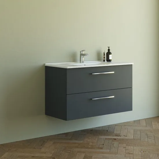 Har du pladsen i dit badeværelse er vores 100 cm vaskeskab fra Mido+ den ideelle løsning. Det enkle og moderne design kombinerer elegance med praktisk funktionalitet. Det flotte vaskeskab er tilgængelig i flere forskellige farver. Amber håndvasken, med sin slanke bordplade og store bassin, er lavet af sanitetsporcelæn, der gør den nem at rengøre og meget slidstærk. Skufferne giver rigelig opbevaringsplads og kan trækkes helt ud for nem adgang. Med soft-close mekanismen lukker skufferne stille og roligt. Standard med stilrene Base greb i krom, men der er mulighed for at tilkøbe greb i andre designs, hvis det ønskes.