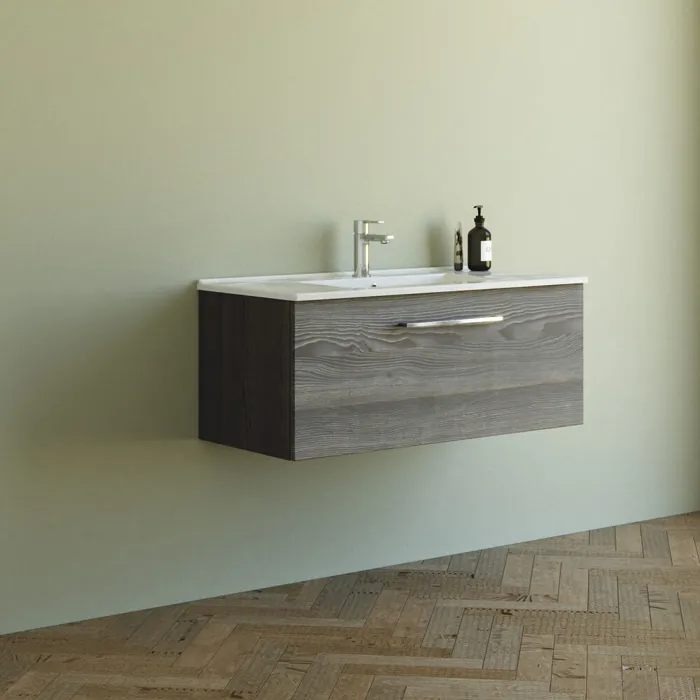Har du plads i dit badeværelse, bør du se nærmere på vores 100 cm møbelpakke, som inkluderer et vaskeskab og en Amber håndvask. Håndvasken er lavet af sanitetsporcelæn, et superstærkt materiale, der er nemt at rengøre og vedligeholde. Håndvasken har en tynd bordplade samt et stort bassin, som passer perfekt på det praktiske vaskeskab. Dette vaskeskab på 100 cm er designet til større badeværelser og giver dig god værdi for pengene med dansk design produceret i Danmark. Skuffen kan trækkes helt ud og har soft-close funktion, så den altid lukker stille og roligt. De enkle og moderne designs og overflader gør det nemt at holde styr på dine ting, og skabet tåler selvfølgelig daglig brug i badeværelset.