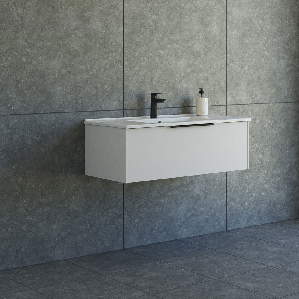 Få ekstra plads og stil på badeværelset med dette 100 cm brede vaskeskab fra Dansani Mido+ Classic. Den glatte front sikrer et rent og strømlinet udtryk, der passer perfekt ind i moderne badeværelsesindretninger. Skuffen er rummelig og giver rigeligt med plads til opbevaring af dine produkter. Den medfølgende Amber vask i sanitetsporcelæn er både robust og let at vedligeholde. Fås i hvid mat, lyseblå mat og sand mat, så du kan tilpasse vaskeskabet til din personlige stil.