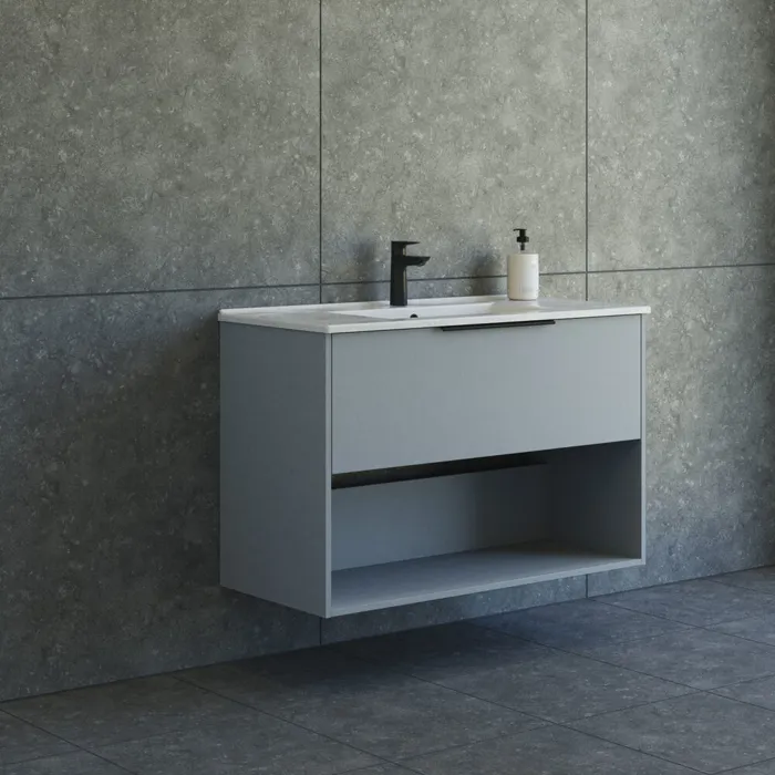 Dette rummelige 100 cm brede vaskeskab fra Dansani Mido+ Classic er perfekt til dem, der ønsker både opbevaring og æstetik. Den glatte front giver et stilrent look, og det åbne opbevaringsrum tilføjer en praktisk detalje til badeværelset. Skuffen giver god plads til at holde orden, mens Amber vasken i sanitetsporcelæn sikrer en hygiejnisk og nem at rengøre overflade. Fås i tre elegante farver: hvid mat, lyseblå mat og sand mat.