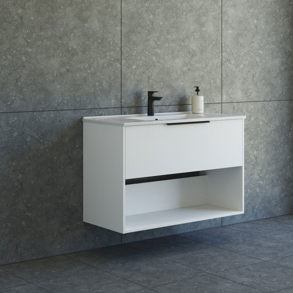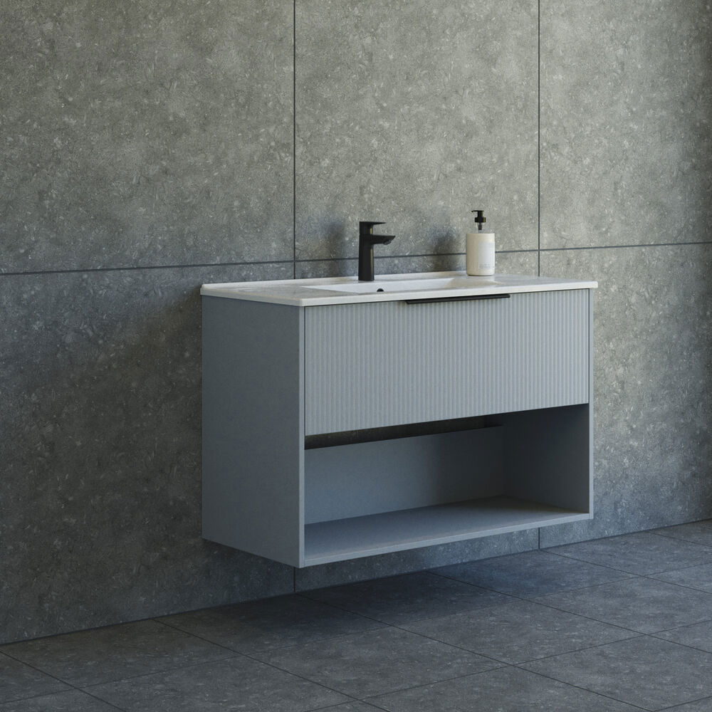 Dette 100 cm brede vaskeskab fra Dansani Mido+ Classic er en ideel løsning for dig, der ønsker både praktisk opbevaring og et stilfuldt design. Den stribede front giver et moderne og iøjnefaldende udtryk, mens det åbne opbevaringsrum gør det nemt at få fat i dine daglige fornødenheder. Amber vasken i sanitetsporcelæn er både holdbar og elegant, hvilket gør den perfekt til det moderne badeværelse. Fås i farverne hvid mat, lyseblå mat og sand mat, så du kan skabe dit drømmebadeværelse.