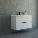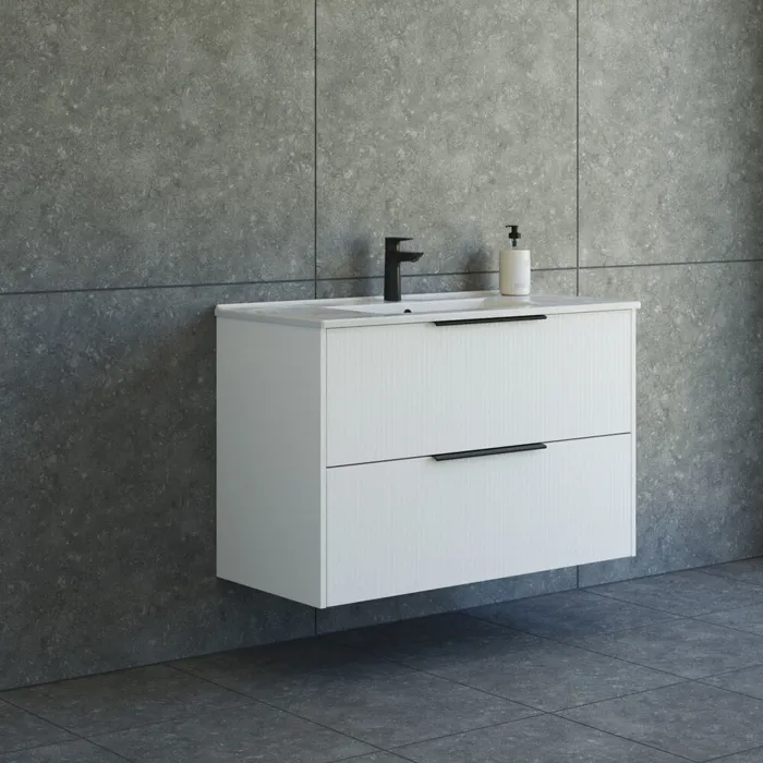 Dette 100 cm brede vaskeskab fra Dansani Mido+ Classic har en dekorativ stribet front, der giver badeværelset et unikt præg. De to skuffer tilbyder rigelig opbevaringsplads til alle dine badeværelsesartikler, og den medfølgende Amber vask i sanitetsporcelæn sikrer et smukt og holdbart finish. Vaskeskabet fås i tre flotte farver: hvid mat, lyseblå mat og sand mat, så du kan vælge den farve, der passer bedst til dit badeværelse.