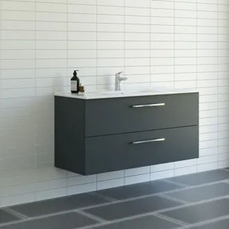 Opnå maksimal opbevaringsplads og stil med vores 120 cm vaskeskab fra Mido+, som selvfølgelig fås i flere forskellige farver, så du får lige det vaskeskab, der passer til din stil. Perfekt til større badeværelser, hvor både funktionalitet og design er vigtige. Amber håndvasken med den elegante, tynde bordplade og det rummelige bassin er lavet af sanitetsporcelæn, som er let at rengøre og yderst holdbart. De store skuffer kan trækkes helt ud, hvilket giver dig det fulde overblik og nem adgang til dine ejendele. Soft-close funktionen sikrer, at skufferne altid lukker stille og roligt. Skabet leveres med stilrene Base greb i krom, men du har mulighed for at tilkøbe greb i andre designs for at matche din personlige stil.