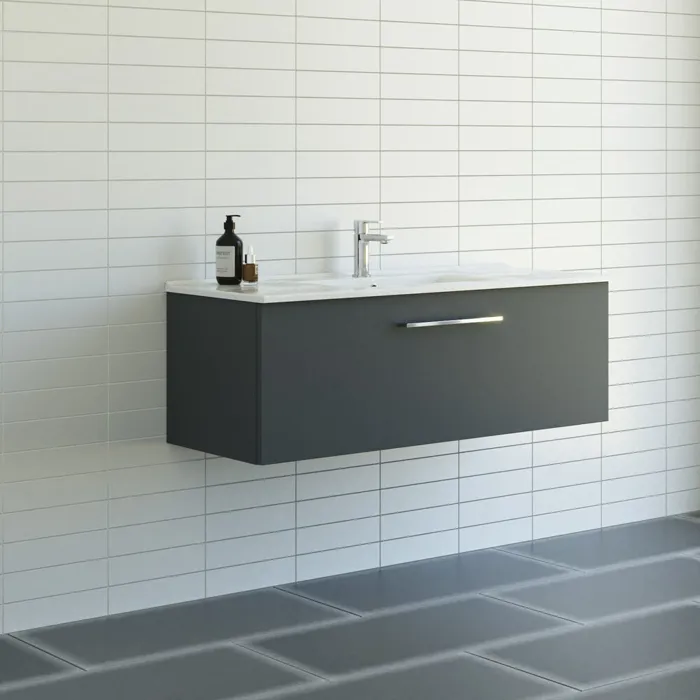 Til store badeværelser er vores 120 cm møbelpakke et ideelt valg. Pakken inkluderer et rummeligt vaskeskab og en Amber håndvask lavet af sanitetsporcelæn, som er slidstærkt og nemt at rengøre. Håndvasken har en tynd bordplade og et stort bassin, hvilket gør den praktisk og flot at se på. Det 120 cm brede vaskeskab er perfekt til store badeværelser. Det er dansk design, produceret i Danmark, og giver god værdi for pengene. I den store skuffe har du masser af plads til dine ting, og skuffen kan trækkes helt ud samt har en soft-close mekanisme, så den lukker stille og roligt. Vaskeskabet er holdbart og nemt at vedligeholde, og det tåler selvfølgelig de daglige udfordringer som mascara-klatter og sæbeklatter.