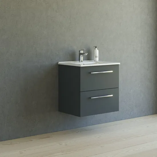 Oplev funktionalitet og stil med vores 60 cm brede vaskeskab fra Mido+, der fås i et væld af farver. Det kompakte design passer perfekt til mindre badeværelser, uden at gå på kompromis med opbevaringsplads. Amber håndvasken med den elegante, tynde bordplade og det store bassin er ikke kun flot, men også praktisk. Sanitetsporcelænet er superstærkt og slidstærkt, hvilket gør rengøringen til en leg. De rummelige skuffer kan trækkes helt ud, hvilket giver dig det fulde overblik og let adgang til dine ting. Skufferne er udstyret med soft-close funktion for en blød og lydløs lukning. De stilrene Base greb i krom følger med som standard, men du har mulighed for at tilkøbe andre greb, der passer til din personlige stil.