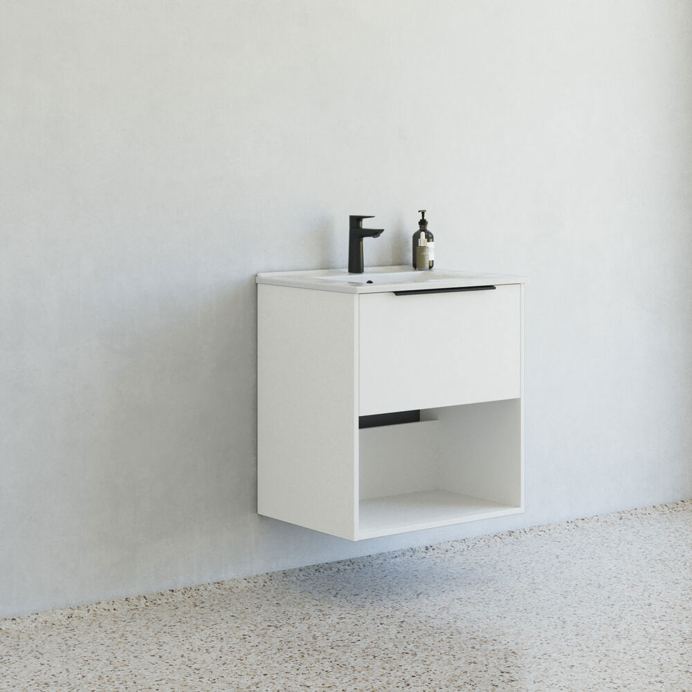 Denne smarte møbelpakke indeholder et 60 cm bredt vaskeskab fra Dansani Mido+ Classic med glat front og et åbent opbevaringsrum. Kombinationen af skuffen og det åbne rum giver både skjult og let tilgængelig opbevaring, der passer til ethvert badeværelse. Med den medfølgende Amber vask i sanitetsporcelæn får du en praktisk og holdbar løsning, der passer til din daglige rutine. Fås i hvid mat, lyseblå mat og sand mat for at matche dit ønskede udtryk.