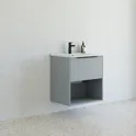 Giv dit badeværelse et personligt præg med dette 60 cm brede vaskeskab fra Dansani Mido+ Classic, der har stribet front og et åbent opbevaringsrum. Det åbne rum giver en let og luftig følelse, mens skuffen holder dine ejendele organiseret. Amber vasken i sanitetsporcelæn er en elegant tilføjelse, der sikrer holdbarhed og funktionalitet. Vælg mellem farverne hvid mat, lyseblå mat eller sand mat for at skabe den perfekte stemning i dit badeværelse.