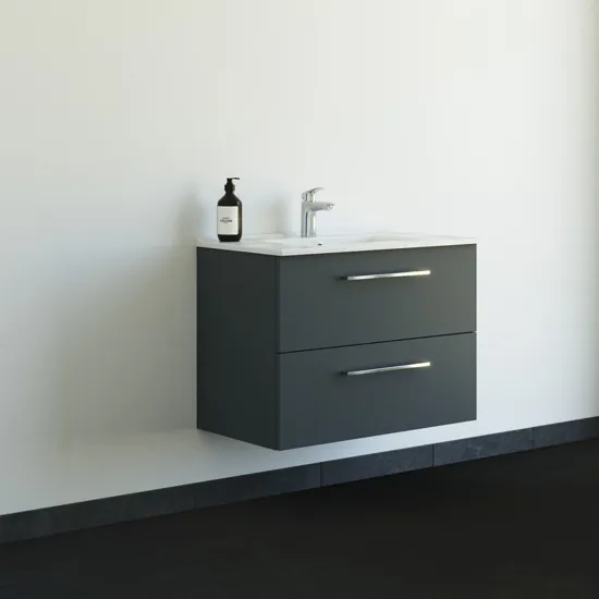 Giv dit badeværelse et løft med vores 80 cm vaskeskab fra Mido+. Du kan få vaskeskabet i mange flotte farver, så du kan få det, der passer bedst ind i dit badeværelse. Det tidssvarende design og de rummelige skuffer tilbyder både æstetik og praktisk opbevaring. Amber håndvasken med den tynde bordplade og store bassin er fremstillet af sanitetsporcelæn, som er nemt at rengøre og yderst holdbart. Skufferne kan trækkes helt ud, hvilket gør det nemt at finde og organisere dine ting. Soft-close funktionen sikrer en lydløs og blød lukning hver gang. Leveres med stilrene Base greb i krom, og du kan altid vælge at tilkøbe andre greb efter din smag.