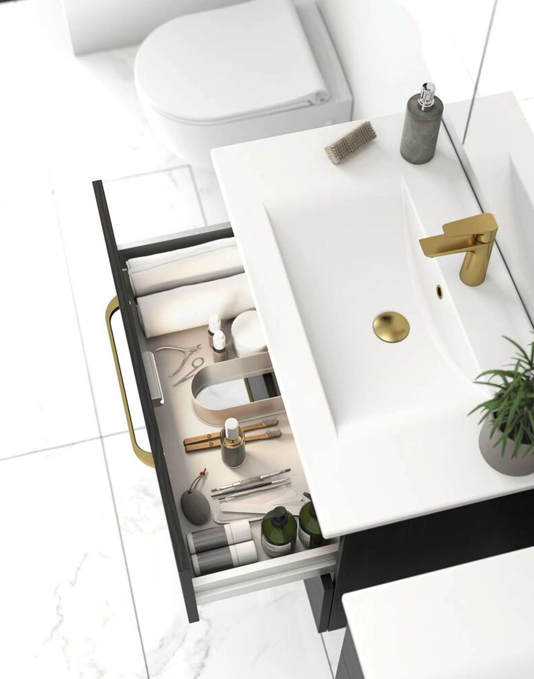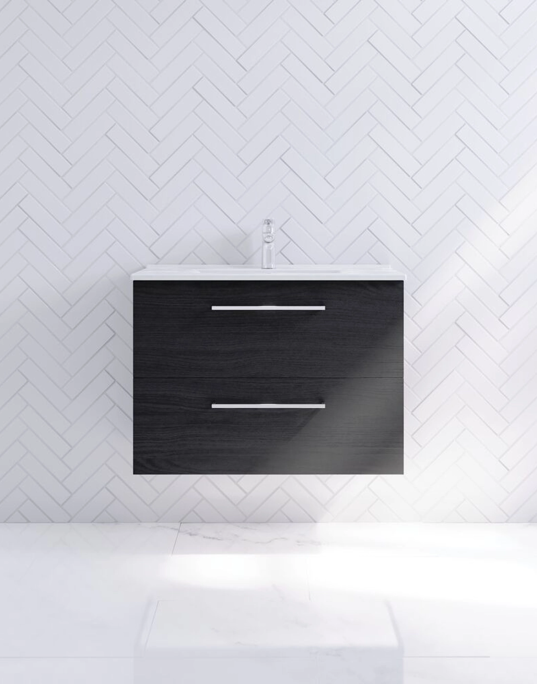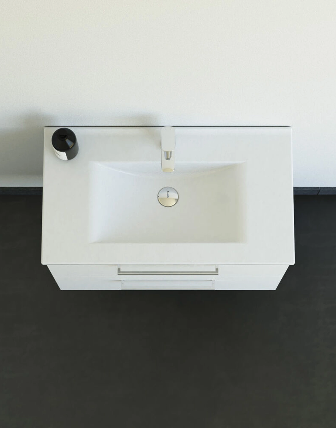 Giv dit badeværelse et løft med vores 80 cm vaskeskab fra Mido+. Du kan få vaskeskabet i mange flotte farver, så du kan få det, der passer bedst ind i dit badeværelse. Det tidssvarende design og de rummelige skuffer tilbyder både æstetik og praktisk opbevaring. Amber håndvasken med den tynde bordplade og store bassin er fremstillet af sanitetsporcelæn, som er nemt at rengøre og yderst holdbart. Skufferne kan trækkes helt ud, hvilket gør det nemt at finde og organisere dine ting. Soft-close funktionen sikrer en lydløs og blød lukning hver gang. Leveres med stilrene Base greb i krom, og du kan altid vælge at tilkøbe andre greb efter din smag.