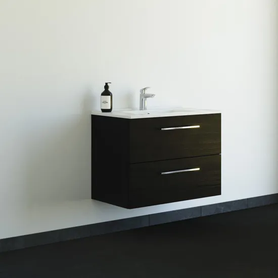 Giv dit badeværelse et løft med vores 80 cm vaskeskab fra Mido+. Du kan få vaskeskabet i mange flotte farver, så du kan få det, der passer bedst ind i dit badeværelse. Det tidssvarende design og de rummelige skuffer tilbyder både æstetik og praktisk opbevaring. Amber håndvasken med den tynde bordplade og store bassin er fremstillet af sanitetsporcelæn, som er nemt at rengøre og yderst holdbart. Skufferne kan trækkes helt ud, hvilket gør det nemt at finde og organisere dine ting. Soft-close funktionen sikrer en lydløs og blød lukning hver gang. Leveres med stilrene Base greb i krom, og du kan altid vælge at tilkøbe andre greb efter din smag.