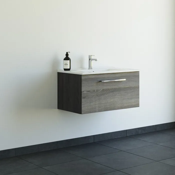 Gør dit badeværelse mere praktisk med vores 80 cm møbelpakke, der består af et vaskeskab og en Amber håndvask. Håndvasken er lavet af sanitetsporcelæn, et robust og rengøringsvenligt materiale, og har en tynd bordplade samt et stort bassin, som gør den både praktisk og flot. Vaskeskabet på 80 cm er ideelt til både små og mellemstore badeværelser. Det er et dansk design, produceret i Danmark, der tilbyder god værdi for pengene. Skuffen kan trækkes helt ud, så du let kan finde det, du skal bruge, og den lukkes blødt og lydløst med soft-close mekanismen. Med enkle og moderne overflader, der er lette at vedligeholde, kan du nemt håndtere daglige brugsspor som mascara og sæbe.