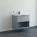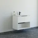 Dette 80 cm brede vaskeskab fra Dansani Mido+ Classic kombinerer funktionalitet og stil med en glat front og et åbent opbevaringsrum. Den rummelige skuffe holder dine ting organiseret, mens det åbne rum giver nem adgang til de ting, du bruger mest. Den medfølgende Amber vask i sanitetsporcelæn er en ideel løsning til daglig brug, da den er både holdbar og let at vedligeholde. Fås i hvid mat, lyseblå mat og sand mat, så du kan finde det perfekte look til dit badeværelse.