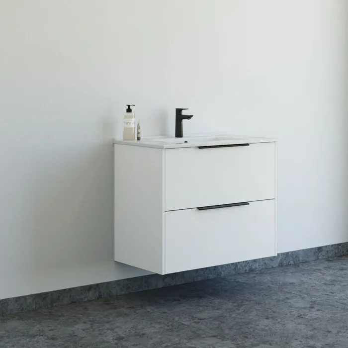 Få både rummelighed og moderne design med dette 80 cm brede vaskeskab fra Dansani Mido+ Classic. Den glatte front giver et rent og tidløst look, mens de to skuffer sørger for masser af opbevaringsplads. Amber vasken i sanitetsporcelæn er slidstærk og nem at rengøre, hvilket gør den ideel til det travle badeværelse. Vælg mellem farverne hvid mat, lyseblå mat og sand mat for at finde den perfekte stil til dit badeværelse.
