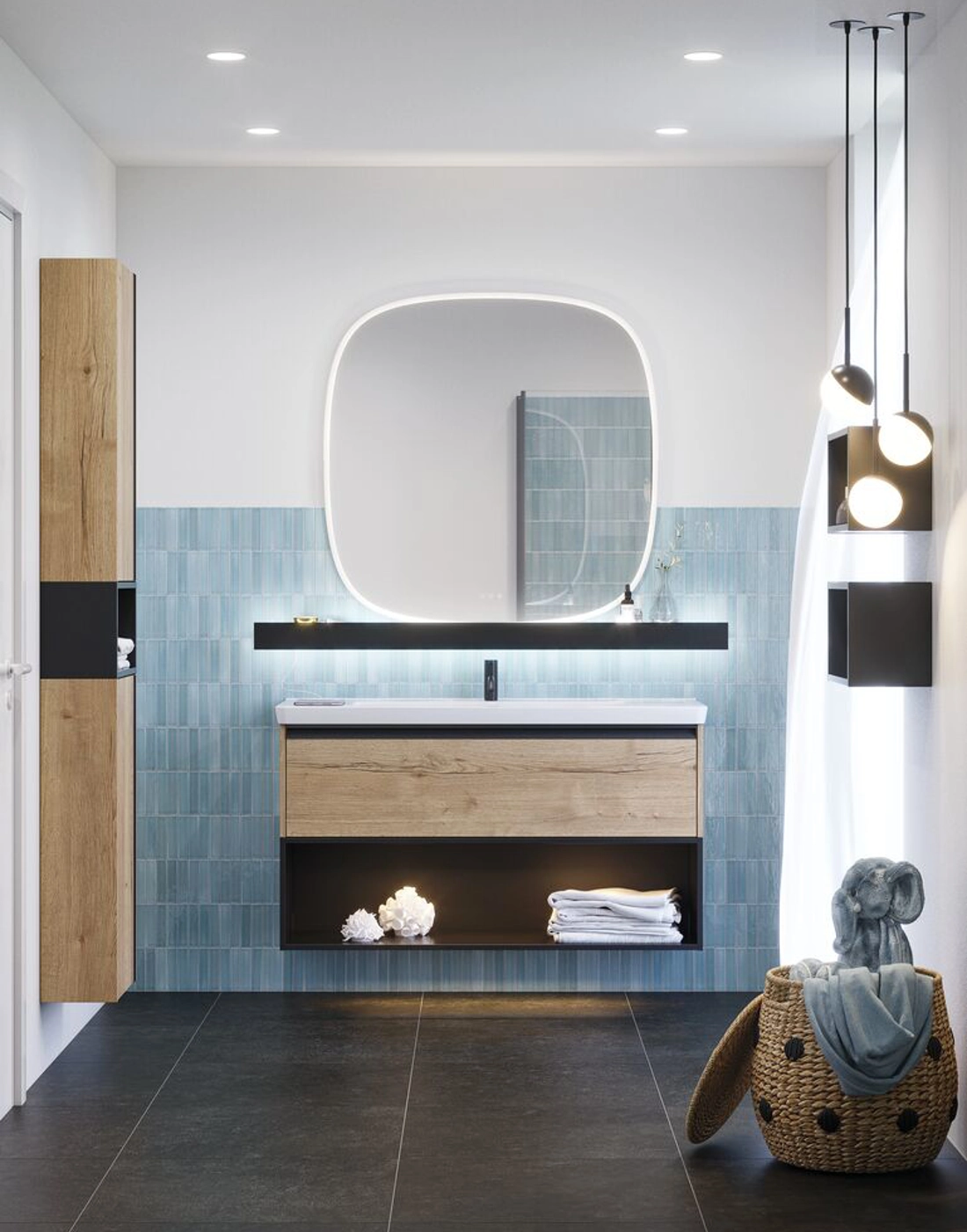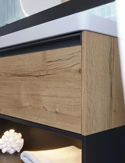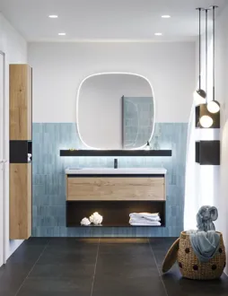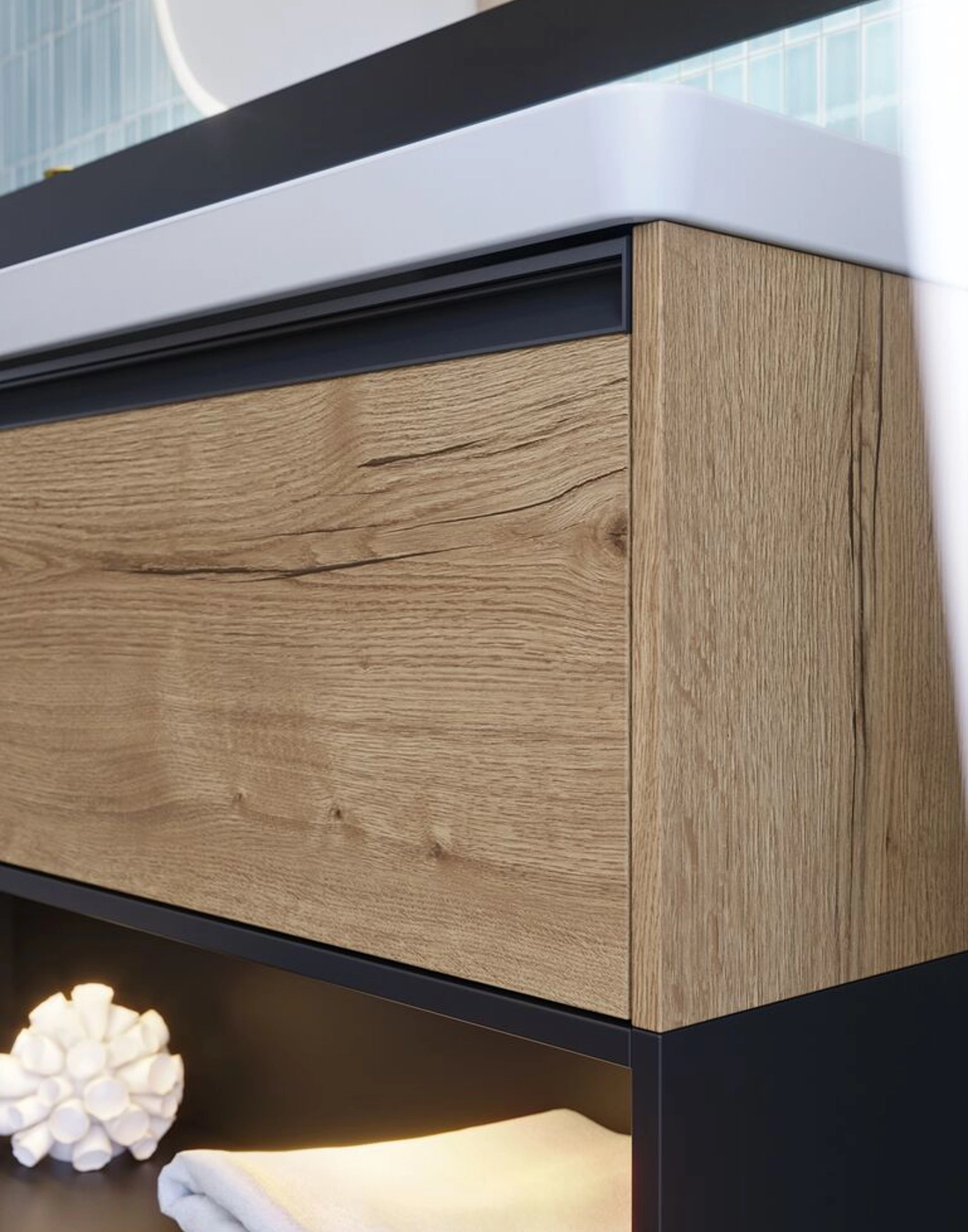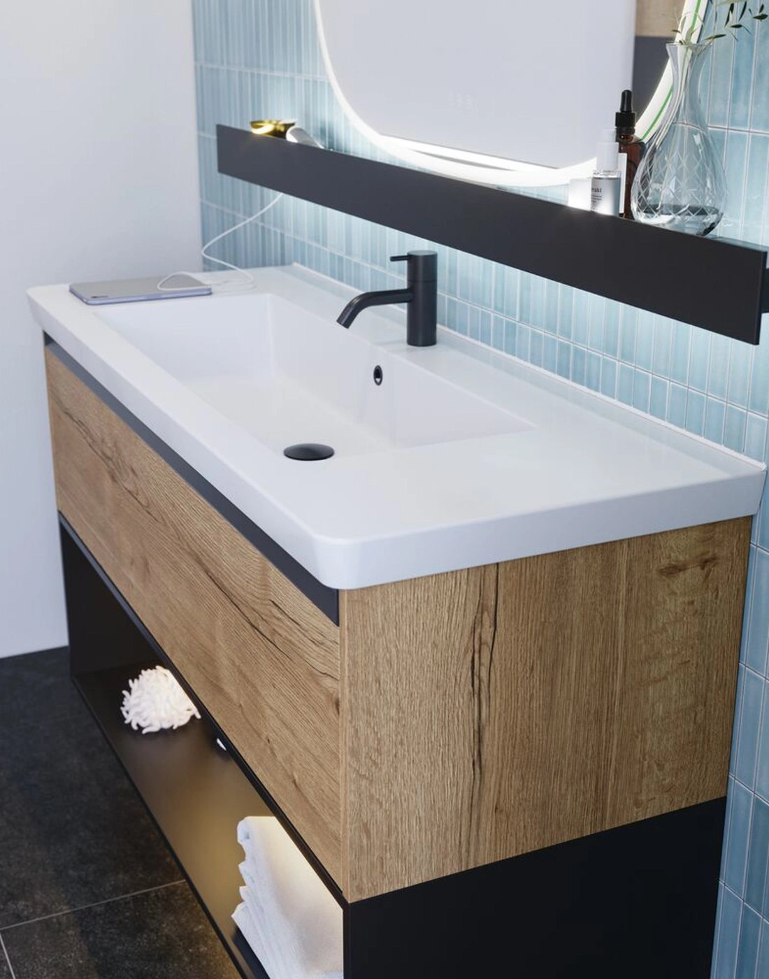 Den åbne reol er helt perfekt til at gøre dit badeværelse personligt og unikt. Denne smarte åbne reol kombineres med et vaskeskab og åbner op for en række forskellige indretningsmuligheder. Skab en skræddersyet løsning ved at sammensætte reolen og vaskeskabet på din helt egen måde, og tilpas din opbevaringsplads til dine behov. Med den åbne reol har du et display til dine yndlingsting, eller et praktisk rum til opbevaring af håndklæder, toiletpapir og lignende. Tilføj lys til din åbne reol for ekstra effekt. Dette tilføjer en subtil belysning, der ikke kun forbedrer præsentationen, men også skaber en behagelig atmosfære på dit badeværelse. OBS: Der er et opstartstillæg (BI1) til produkter med valgfri farve. Det betales én gang pr. valgfri farve uanset antal produkter.
