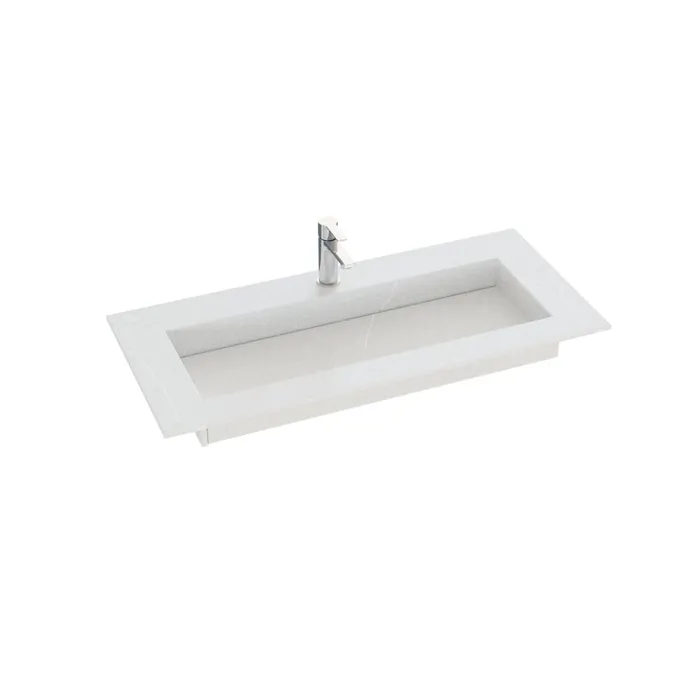 Med Angular håndvasken får du ikke blot et elegant og kantet design, men også muligheden for at få en vask, der passer perfekt til dit badeværelse. Vasken kan skræddersys efter mål, hvilket betyder, at den kan tilpasses præcist til dine behov og rummets dimensioner. Denne fleksibilitet gør Angular til det ideelle valg, når du ønsker en vask, der både er funktionel og designmæssigt integrerer sig optimalt i dit badeværelsesindretning. Håndvasken er udviklet i samarbejde med Cosentino og fås i både de klassiske Silestone dekorer og den nye, bæredygtige Trilium dekor i Dekton. Trilium står med sit rå, fliselignende udseende og er fremstillet af op til 80% genbrugsmateriale, hvilket giver vasken et ekstra miljøvenligt touch. Den elegante designfilosofi omfatter et skrånet bassin, der leder vandet effektivt mod et skjult afløb, hvilket resulterer i et både stilfuldt og praktisk design. Silestone og Dekton materialerne er ikke kun smukke, men også bæredygtige, da de produceres med vedvarende energi og genanvender 99% af vandet i produktionen.