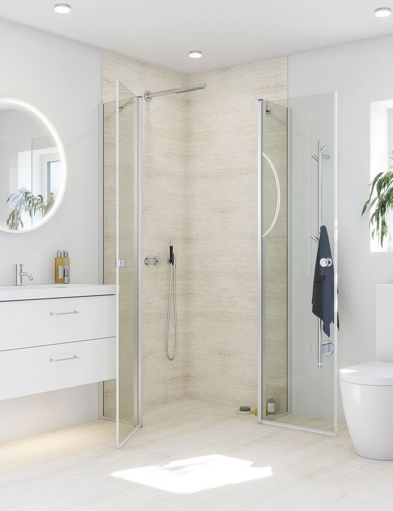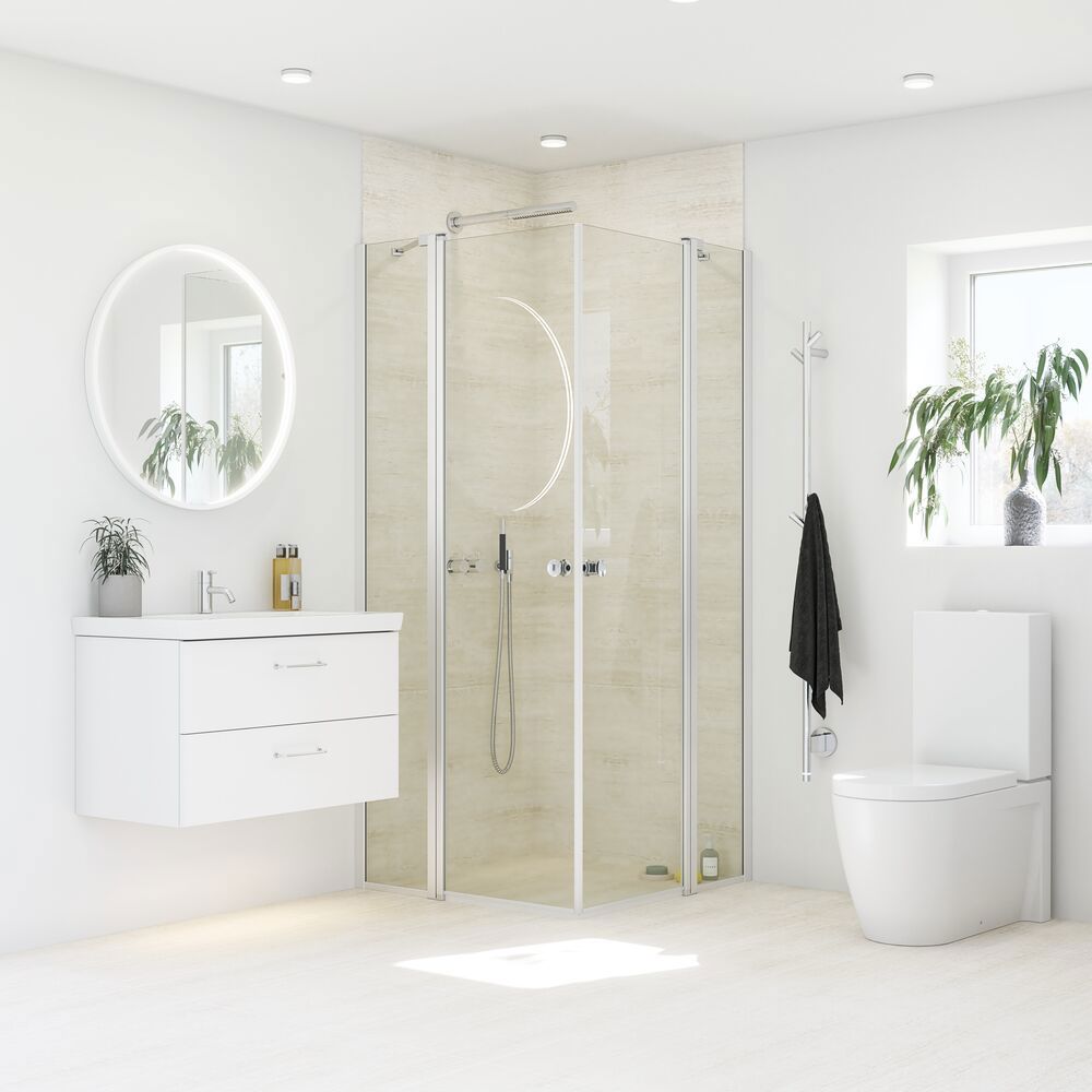 Faste vægge med svingdør tilbyder en stabil og elegant afskærmning omkring bruseren, der minimerer vandspild og skaber en følelse af privatliv. Du kan møblere tæt op ad dit brusehjørne, hvilket er praktisk, hvis du har begrænset med plads. Den indbyggede svingdør kan skubbes ind uden at ramme armaturet, når du ikke bruger bruseren, hvilket giver dig mere plads i dit badeværelse. Glasset er lavet af hærdet sikkerhedsglas og behandlet med EasyCare, der sikrer langvarig holdbarhed og sikkerhed. Med Dansanis faste vægge med svingdør får du både en elegant og funktionel løsning til dit badeværelse.