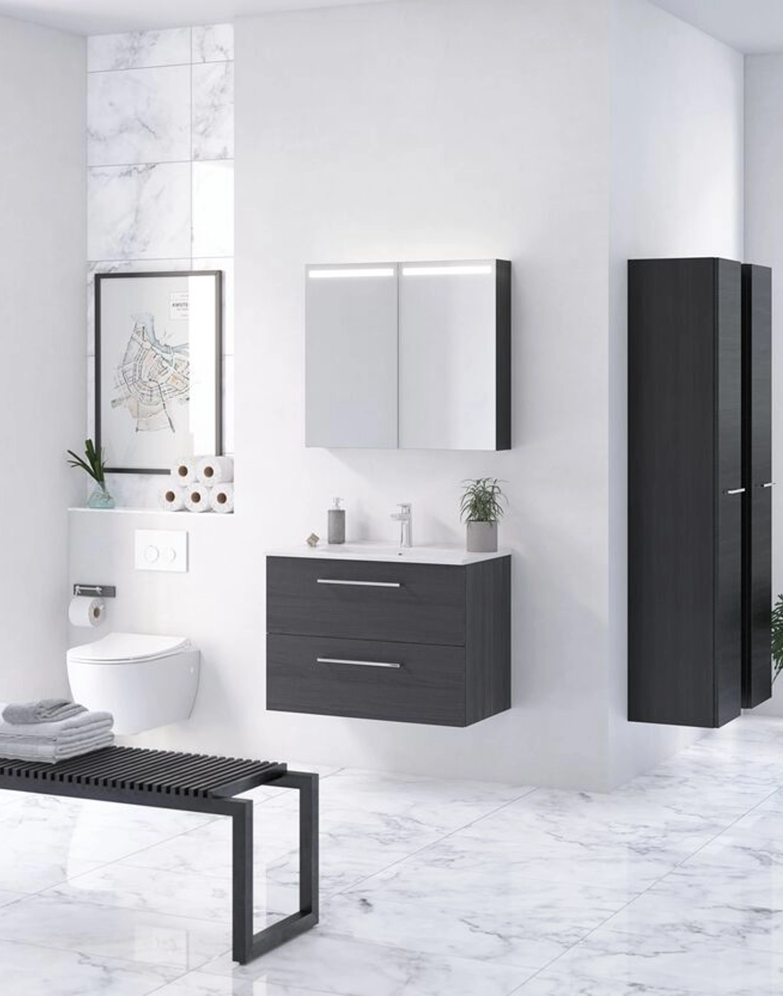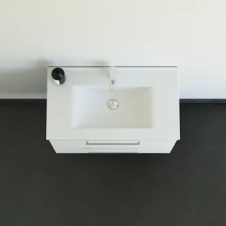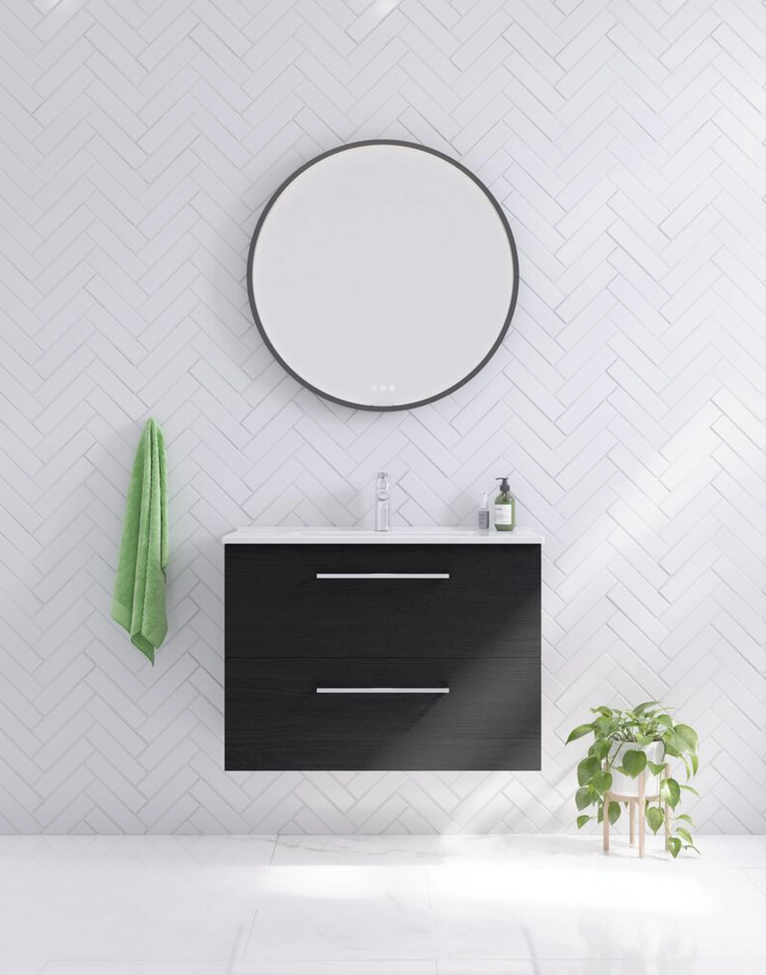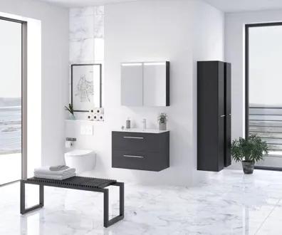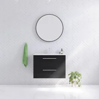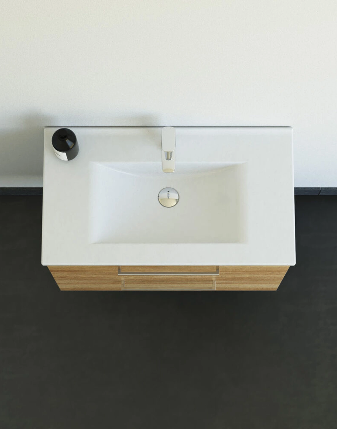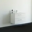 Giv dit badeværelse et løft med vores 80 cm vaskeskab fra Mido+. Du kan få vaskeskabet i mange flotte farver, så du kan få det, der passer bedst ind i dit badeværelse. Det tidssvarende design og de rummelige skuffer tilbyder både æstetik og praktisk opbevaring. Amber håndvasken med den tynde bordplade og store bassin er fremstillet af sanitetsporcelæn, som er nemt at rengøre og yderst holdbart. Skufferne kan trækkes helt ud, hvilket gør det nemt at finde og organisere dine ting. Soft-close funktionen sikrer en lydløs og blød lukning hver gang. Leveres med stilrene Base greb i krom, og du kan altid vælge at tilkøbe andre greb efter din smag.