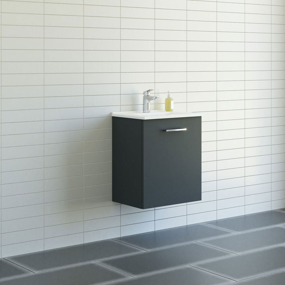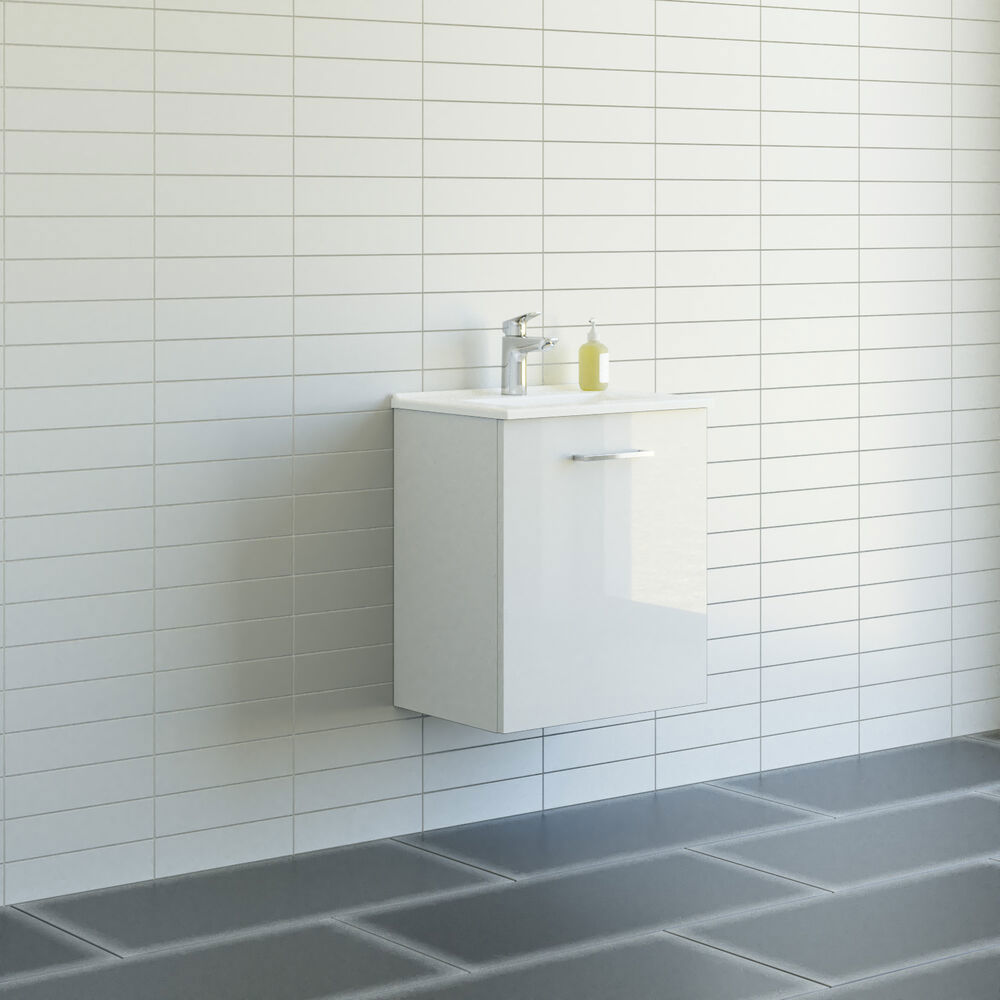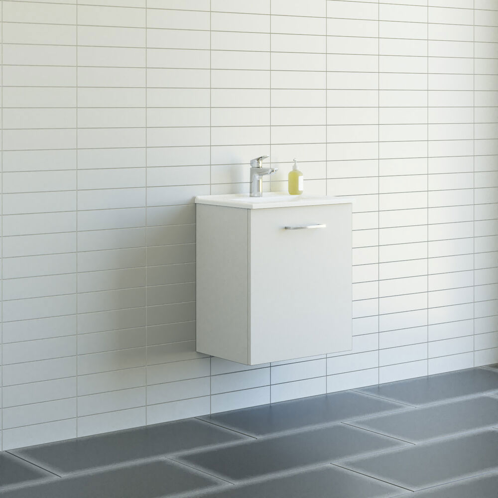 Denne 50 cm møbelpakke med venstrehængslet låge er ideel til mindre badeværelser, hvor pladsen skal udnyttes optimalt. Med tidssvarende designs og overflader, der indbyder til gode vaskerutiner, tåler møbelpakken både mascara-klatter og høj skumføring hver eneste dag. Bag den venstrehængslede låge finder du god hyldeplads til håndklæder og rengøringsflasker, og lågen lukker med soft-close, som kan finjusteres efter behov. Amber Mini håndvasken i sanitetsporcelæn har afrundede sider og en god dybde. Vasken er både holdbar og nem at rengøre. Vælg mellem seks klassiske farver og overflader: hvid mat, hvid højglans, grå mat, pine grey, sort struktur og varm eg. Leveres færdigsamlet og klar til montering.