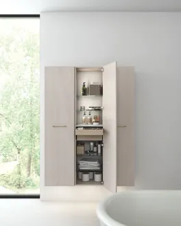 Opbevaring i badeværelset bliver enkelt og stilfuldt med Dansani Calidris højskabe. Disse skabe er ikke blot et funktionelt element, men også en æstetisk fornøjelse, der passer perfekt ind i moderne badeværelsesindretninger. Med smarte hylder og ruminddelinger giver Calidris højskabene dig mulighed for at organisere alt fra håndklæder og toiletartikler til skønhedsprodukter på en overskuelig måde. Det elegante design og de rene linjer af højskabene giver en følelse af orden og harmoni i badeværelsesmiljøet. OBS: Der er et opstartstillæg (BI1) til produkter med eg og valgfri farve. Betales én gang pr. eg og valgfri farve uanset antal produkter. Husk at tilvælge de små praktiske ting til dine badeværelsesmøbler, som du dagligt vil glæde dig over. Fx lys i skuffer og skabe, indbygget el-stik og dæmpet sensorlys under møblet, som guider det natlige badeværelsesbesøg. Tilvalg bestilles samtidig med dine møbler.