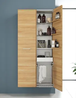 Gør brug af hver centimeter plads i dit badeværelse med Dansani Mido+ højskabet. Men et højskab får du plads til alle dine ting på badeværelset, så har du pladsen til det, så anbefaler vi helt klart et højskab til dit badeværelse. I dette højskab finder du 1 træhylde, 4 glashylder samt 3 hylder i selve lågen, så du her får god plads og mulighed for at indrette dit optimalt på badeværelset. Oplev en ny dimension af orden og design på dit badeværelse med Dansani Mido+ højskabet.