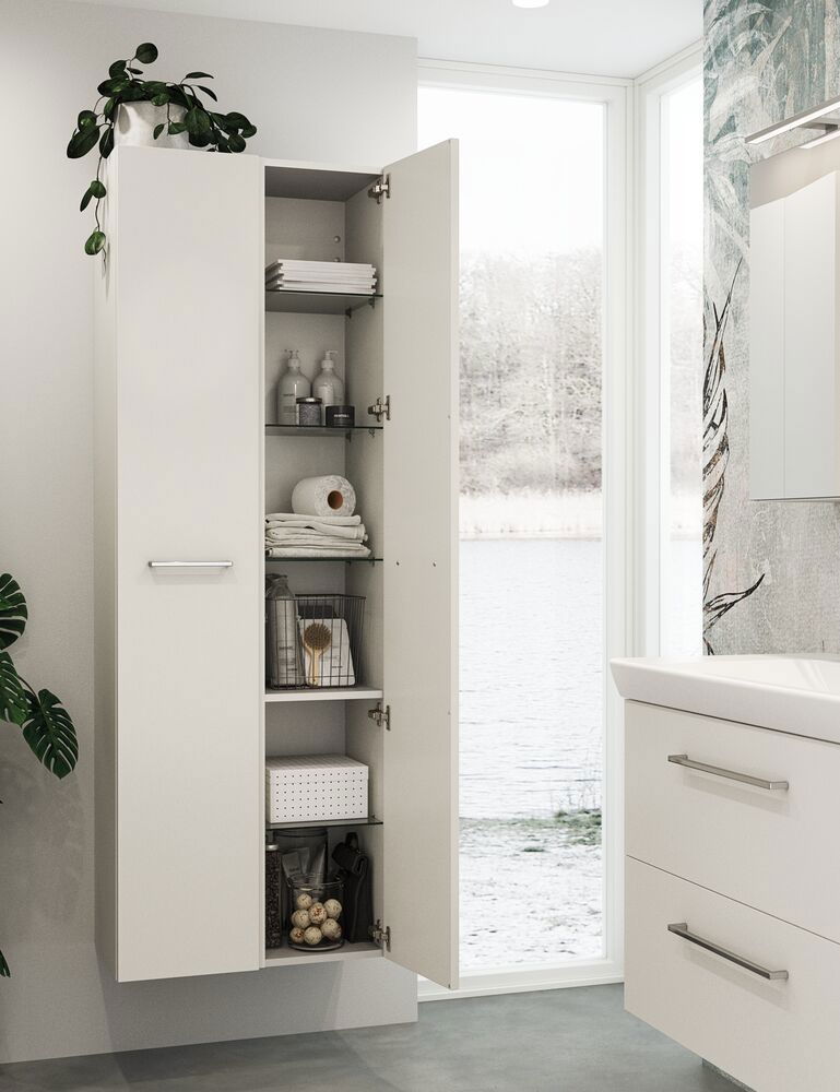 Skab elegance og funktionalitet på dit badeværelse med dette Dansani Mido+ højskab. Med højskabet får du masser af ekstra opbevaringsplads på badeværelset, og her i skabet finder du 1 træhylde og 4 smukke glashylder. Et højskab er en virkelig god løsning, hvis du har brug for ekstra opbevaring på badeværelset, og her får du en løsning, der samtidigt skaber en følelse af luksus i dit baderum. Med lækkert dansk design og smarte opbevaringsmuligheder er dette højskab en ideel tilføjelse til ethvert stilfuldt badeværelse.