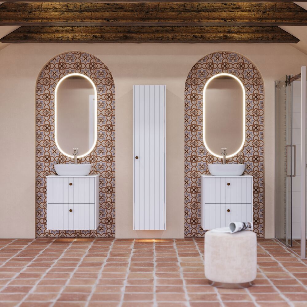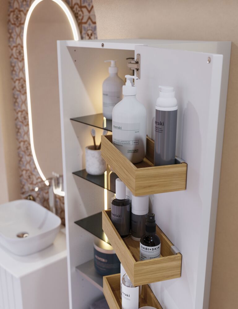 Skab en indbydende atmosfære i dit badeværelse med dette højskab med rillede front i version B. Dette 176 cm høje skab har en træhylde, tre forkortede glashylder, tre træbakker på lågen og to glashylder. Den rummelige opbevaringsplads sikrer, at du har alt inden for rækkevidde, mens de rillede detaljer tilføjer et klassisk touch til indretningen. Højskabet er perfekt til opbevaring af toiletartikler, håndklæder og andre nødvendigheder, og dets stilfulde design gør det til en æstetisk del af dit badeværelse. OBS: Der er et opstartstillæg (BI1) til produkter med valgfri farve. Det betales én gang pr. valgfri farve uanset antal produkter. Husk at tilvælge de små praktiske ting til dine badeværelsesmøbler, som du dagligt vil glæde dig over. Fx lys i skuffer og skabe, indbygget el-stik og dæmpet sensorlys under møblet, som guider det natlige badeværelsesbesøg. Tilvalg bestilles samtidig med dine møbler.