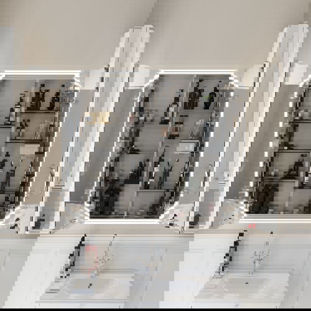 Få en smart opgradering til dit badeværelse med Dansani's In-built spejlskab. Det er indbygget, praktisk og virkelig flot. Du kan nemt bruge det til at gøre dig klar hver dag, og det passer perfekt ind i badeværelset. Med In-built spejlskabet får du både stil og funktion i ét - det er det ideelle valg til dit badeværelse. Til In-built spejlskabet medfølger en smuk lysramme, som lyser hele vejen rundt om spejlet, og som selvfølgelig kan styres med den indbyggede lysstyring.